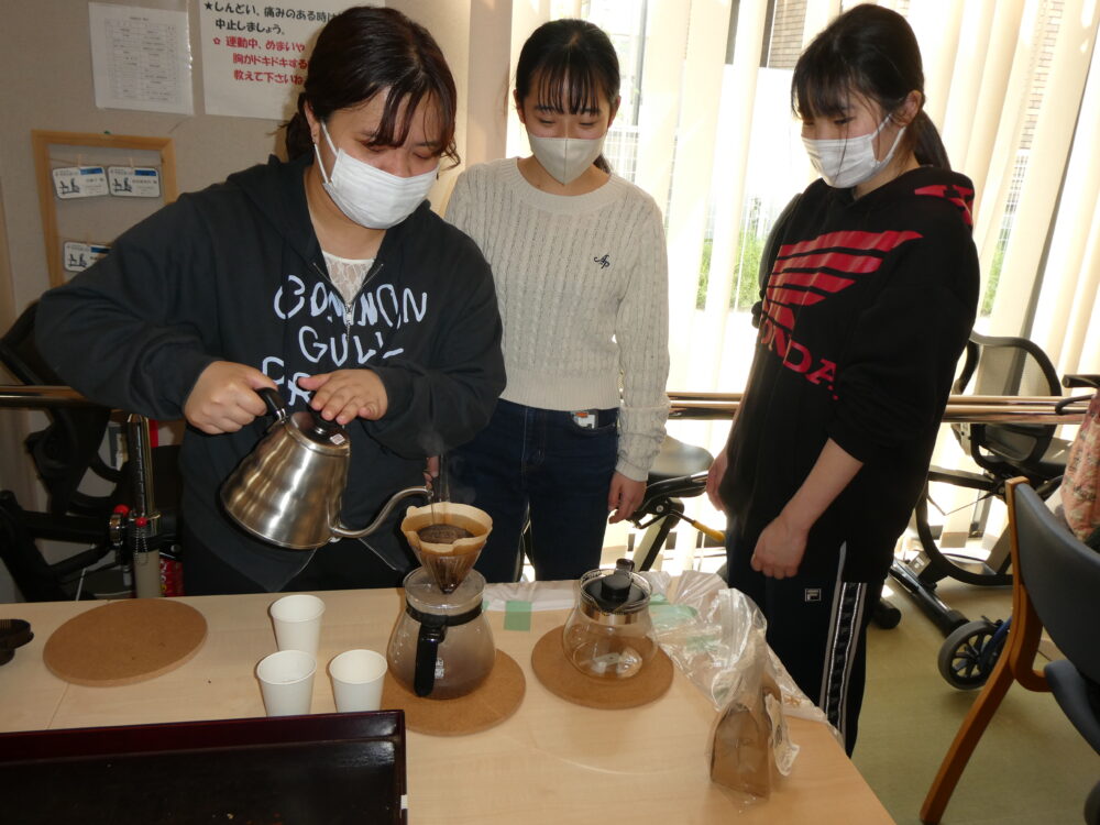 同時にコーヒーの焙煎が始まると辺りに豆のいい香りが漂い、思わず香りの方へ体を向けて「いいにおいやな、楽しみやで!」と学生さんに声をかけて下さるご利用者様もいらっしゃいました♪